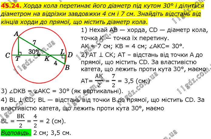 Хорда кола перетинає його діаметр під кутом 30° і ділиться діаметром на відрізки завдовжки 4 см і 7 см. Знайдіть відстань від кінців хорди до прямої, що містить діаметр кола. 1) Нехай AB — хорда, CD — діаметр кола, точка К — точка їх перетину. AK = 7 см; KB = 4 см; ∠AKC= 30°. 2) AT ⊥ CK; AT – відстань від точки А до прямої, що містить CD. За властивістю катета, що лежить проти кута 30°, маємо AT= АК/2 = 7/2 = 3,5 (см.) 3) ∠DKB = ∠AKC = 30° (як вертикальні). 4) BL ⊥ CD; BL — відстань від точки В до прямої, що містить CD. За властивістю катета, що лежить проти кута 30°, маємо BL = ВК/2 = 4/2 = 2 (см). Відповідь. 2 см; 3,5 см.
