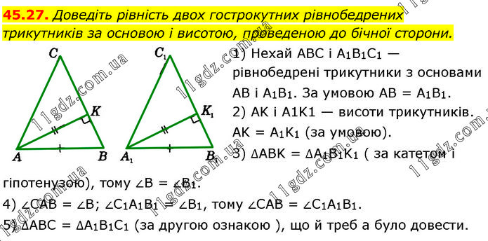 Доведіть рівність двох гострокутних рівнобедрених трикутників за основою і висотою, проведеною до бічної сторони. 1) Нехай ABC і A1B1C1 — рівнобедрені трикутники з основами AB і A1B1. За умовою AB = A1B1. 2) AK і A1K1 — висоти трикутників. AK = A1K1 (за умовою). 3) ∆ABK = ∆A1B1K1 ( за катетом і гіпотенузою), тому ∠В = ∠B1. 4) ∠САВ = ∠В; ∠C1A1B1 = ∠B1, тому ∠САВ = ∠C1A1B1. 5) ∆ABC = ∆A1B1C1 (за другою ознакою ), що й треб а було довести.