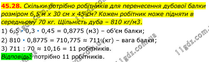 Скільки потрібно робітників для перенесення дубової балки розміром 6,5 м х 30 см х 45 см? Кожен робітник може підняти в середньому 70 кг. Щільність дуба – 810 кг/м3. 1) 6,5 ∙ 0,3 ∙ 0,45 = 0,8775 (м3) – об’єм балки; 2) 810 ∙ 0,8775 = 710,775 ≈ 711 (кг) – вага балки; 3) 711 : 70 ≈ 10,16 = 11 робітників. Відповідь: потрібно 11 робітників.