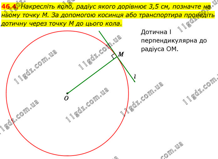 Накресліть коло, радіус якого дорівнює 3,5 см, позначте на ньому точку М. За допомогою косинця або транспортира проведіть дотичну через точку M до цього кола. Дотична l перпендикулярна до радіуса ОМ.