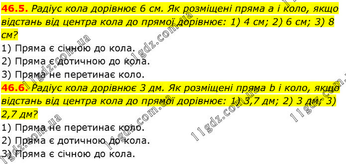 46.5. Радіус кола дорівнює 6 см. Як розміщені пряма а і коло, якщо відстань від центра кола до прямої дорівнює: 1) 4 см; 2) 6 см; 3) 8 см? 1) Пряма є січною до кола. 2) Пряма є дотичною до кола. 3) Пряма не перетинає коло. 46.6. Радіус кола дорівнює 3 дм. Як розміщені пряма b і коло, якщо відстань від центра кола до прямої дорівнює: 1) 3,7 дм; 2) 3 дм; 3) 2,7 дм? 1) Пряма не перетинає коло. 2) Пряма є дотичною до кола. 3) Пряма є січною до кола.