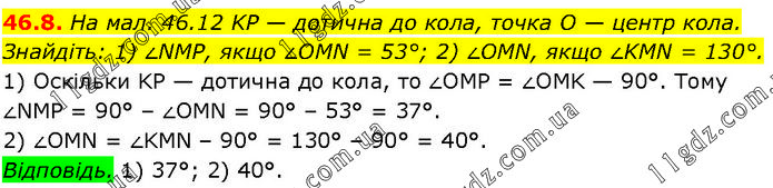 На мал. 46.12 KP — дотична до кола, точка O — центр кола. Знайдіть: 1) ∠NMP, якщо ∠OMN = 53°; 2) ∠OMN, якщо ∠KMN = 130°. 1) Оскільки KP — дотична до кола, то ∠OMP = ∠OMK — 90°. Тому ∠NMP = 90° – ∠OMN = 90° – 53° = 37°. 2) ∠OMN = ∠KMN – 90° = 130° – 90° = 40°. Відповідь. 1) 37°; 2) 40°.