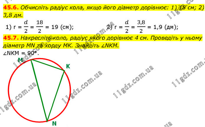 45.6. Обчисліть радіус кола, якщо його діаметр дорівнює: 1) 18 см; 2) 3,8 дм. 1) r = d/2 = 18/2 = 19 (см); 2) r = d/2 = 3,8/2 = 1,9 (дм); 45.7. Накресліть коло, радіус якого дорівнює 4 см. Проведіть у ньому діаметр MN та хорду MK. Знайдіть ∠NKM. ∠NKM = 90°.