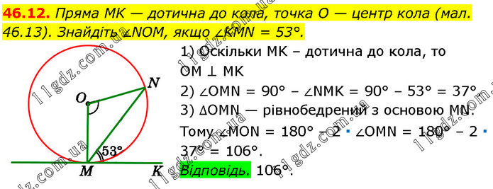 Пряма MK — дотична до кола, точка O — центр кола (мал. 46.13). Знайдіть ∠NOM, якщо ∠KMN = 53°. 1) Оскільки MK – дотична до кола, то OM ⊥ MK; 2) ∠OMN = 90° – ∠NMK = 90° – 53° = 37°. 3) ∆OMN — рівнобедрений з основою MN. Тому ∠MON = 180° – 2 ∙ ∠OMN = 180° – 2 ∙ 37° = 106°. Відповідь. 106°.