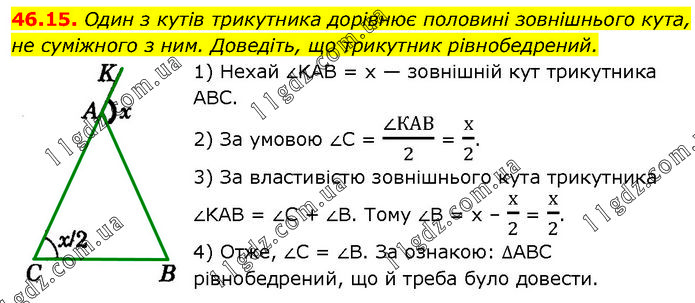 Один з кутів трикутника дорівнює половині зовнішнього кута, не суміжного з ним. Доведіть, що трикутник рівнобедрений. 1) Нехай ∠KAB = х — зовнішній кут трикутника ABC. 2) За умовою ∠C = (∠КАВ)/2 = х/2. 3) За властивістю зовнішнього кута трикутника ∠KAB = ∠C + ∠B. Тому ∠B = х – х/2 = х/2. 4) Отже, ∠C = ∠B. За ознакою: ∆ABC рівнобедрений, що й треба було довести.