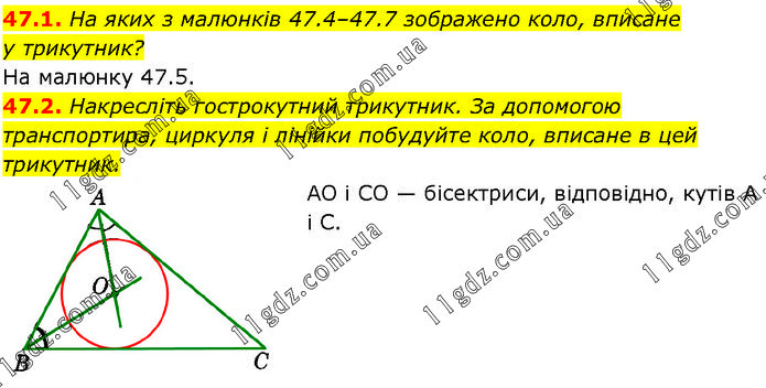 47.1. На яких з малюнків 47.4–47.7 зображено коло, вписане у трикутник? На малюнку 47.5. 47.2. Накресліть гострокутний трикутник. За допомогою транспортира, циркуля і лінійки побудуйте коло, вписане в цей трикутник. AO і CO — бісектриси, відповідно, кутів A і C.