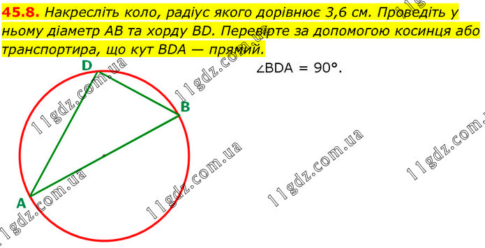 Накресліть коло, радіус якого дорівнює 3,6 см. Проведіть у ньому діаметр AB та хорду BD. Перевірте за допомогою косинця або транспортира, що кут BDA — прямий. ∠BDA = 90°.