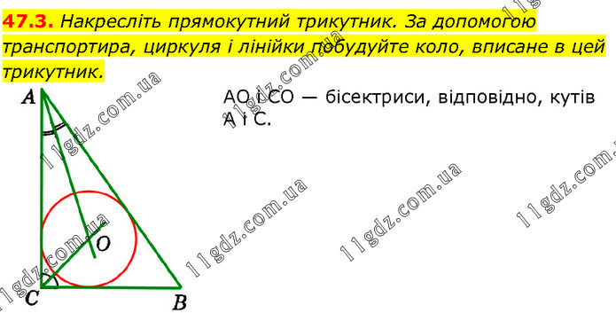 Накресліть прямокутний трикутник. За допомогою транспортира, циркуля і лінійки побудуйте коло, вписане в цей трикутник. АО і CO — бісектриси, відповідно, кутів A і C.