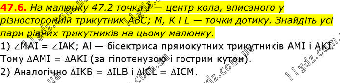 На малюнку 47.2 точка І — центр кола, вписаного у різносторонній трикутник ABC; М, K i L — точки дотику. Знайдіть усі пари рівних трикутників на цьому малюнку. 1) ∠MAI = ∠IAK; Al — бісектриса прямокутних трикутників AMI і AKI. Тому ∆AMI = ∆AKI (за гіпотенузою і гострим кутом). 2) Аналогічно ∆IKB = ∆ILB і ∆lCL = ∆ICM.