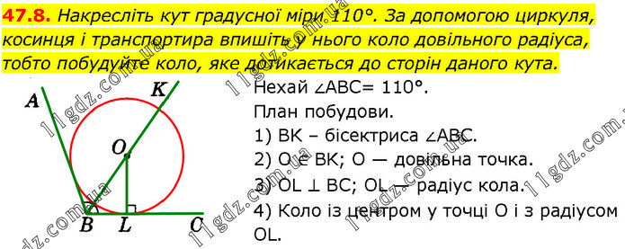 Накресліть кут градусної міри 110°. За допомогою циркуля, косинця і транспортира впишіть у нього коло довільного радіуса, тобто побудуйте коло, яке дотикається до сторін даного кута. Нехай ∠ABC= 110°. План побудови. 1) BK – бісектриса ∠ABC. 2) O ∈ BK; O — довільна точка. 3) OL ⊥ BC; OL — радіус кола. 4) Коло із центром у точці O і з радіусом OL.