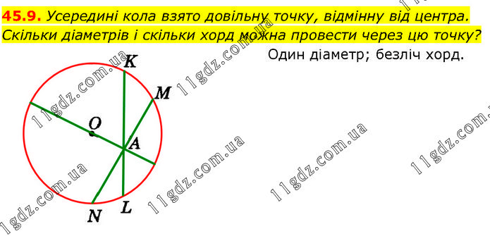 Усередині кола взято довільну точку, відмінну від центра. Скільки діаметрів і скільки хорд можна провести через цю точку? Один діаметр; безліч хорд.