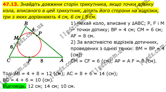 Знайдіть довжини сторін трикутника, якщо точки дотику кола, вписаного в цей трикутник, ділять його сторони на відрізки, три з яких дорівнюють 4 см, 6 см і 8 см. 1) Нехай коло, вписане у ∆ABC; Р, F і M — точки дотику; BP = 4 см; CM = 6 см; AF = 8 см. 2) За властивістю відрізків дотичних, проведених з однієї точки: BM = BP = 4 (см); CM = CF = 6 (см); AP = A F = 8 (см). Тоді AB = 4 + 8 = 12 (см); AC = 8 + 6 = 14 (см); BC = 4 + 6 = 10 (см). Відповідь. 12 см; 14 см; 10 см.