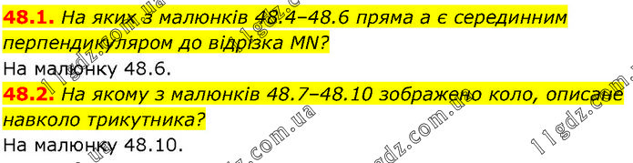 48.1. На яких з малюнків 48.4–48.6 пряма а є серединним перпендикуляром до відрізка MN? На малюнку 48.6. 48.2. На якому з малюнків 48.7–48.10 зображено коло, описане навколо трикутника? На малюнку 48.10.