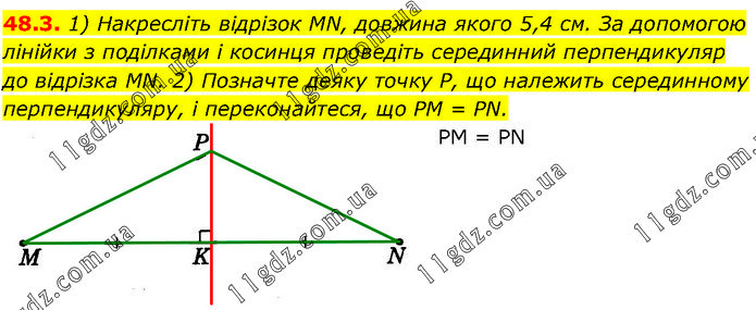 1) Накресліть відрізок MN, довжина якого 5,4 см. За допомогою лінійки з поділками і косинця проведіть серединний перпендикуляр до відрізка MN. 2) Позначте деяку точку Р, що належить серединному перпендикуляру, і переконайтеся, що PM = PN. PM = PN.