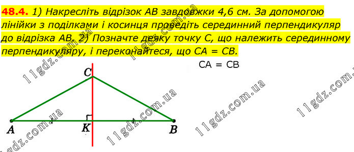 1) Накресліть відрізок AB завдовжки 4,6 см. За допомогою лінійки з поділками і косинця проведіть серединний перпендикуляр до відрізка AB. 2) Позначте деяку точку С, що належить серединному перпендикуляру, і переконайтеся, що CA = CB. СА = СВ.
