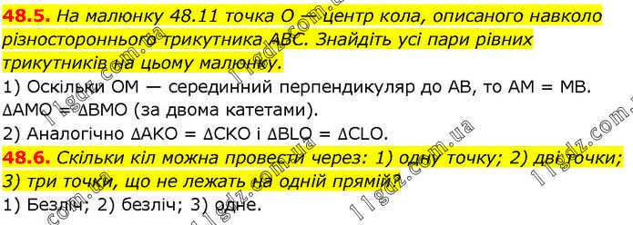 48.5. На малюнку 48.11 точка O — центр кола, описаного навколо різностороннього трикутника ABC. Знайдіть усі пари рівних трикутників на цьому малюнку. 1) Оскільки OM — серединний перпендикуляр до AB, то AM = MB. ∆AMO = ∆BMO (за двома катетами). 2) Аналогічно ∆AKO = ∆CKO і ∆BLO = ∆CLO. 48.6. Скільки кіл можна провести через: 1) одну точку; 2) дві точки; 3) три точки, що не лежать на одній прямій? 1) Безліч; 2) безліч; 3) одне.