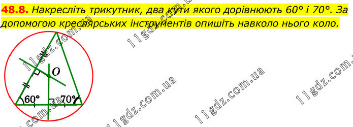 Накресліть трикутник, два кути якого дорівнюють 60° і 70°. За допомогою креслярських інструментів опишіть навколо нього коло.
