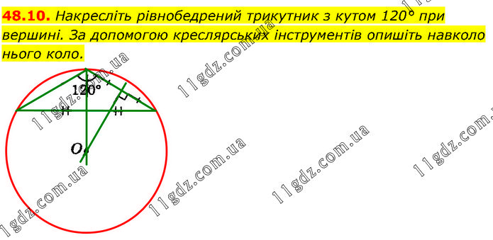 Накресліть рівнобедрений трикутник з кутом 120° при вершині. За допомогою креслярських інструментів опишіть навколо нього коло.