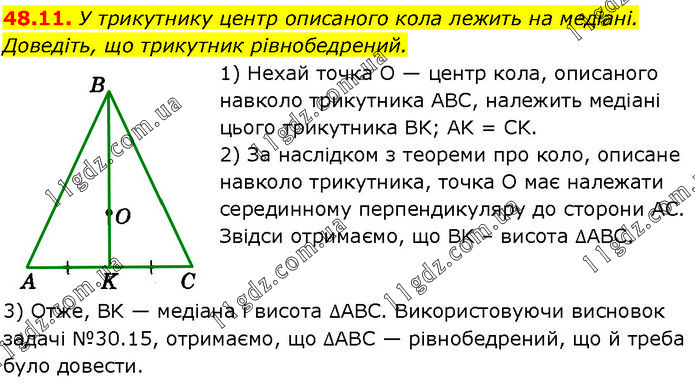 У трикутнику центр описаного кола лежить на медіані. Доведіть, що трикутник рівнобедрений. 1) Нехай точка O — центр кола, описаного навколо трикутника ABC, належить медіані цього трикутника BK; AK = CK. 2) За наслідком з теореми про коло, описане навколо трикутника, точка O має належати серединному перпендикуляру до сторони АС. Звідси отримаємо, що BK – висота ∆ABC. 3) Отже, BK — медіана і висота ∆ABC. Використовуючи висновок задачі №30.15, отримаємо, що ∆ABC — рівнобедрений, що й треба було довести.