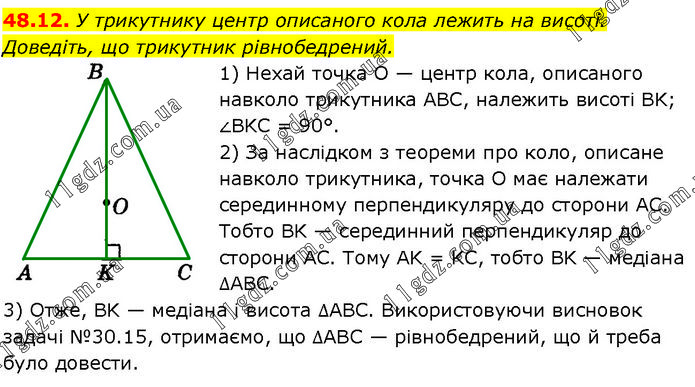 У трикутнику центр описаного кола лежить на висоті. Доведіть, що трикутник рівнобедрений. 1) Нехай точка O — центр кола, описаного навколо трикутника ABC, належить висоті BK; ∠BKC = 90°. 2) За наслідком з теореми про коло, описане навколо трикутника, точка O має належати серединному перпендикуляру до сторони АС. Тобто BK — серединний перпендикуляр до сторони АС. Тому AK = KC, тобто BK — медіана ∆ABC. 3) Отже, BK — медіана і висота ∆ABC. Використовуючи висновок задачі №30.15, отримаємо, що ∆ABC — рівнобедрений, що й треба було довести.