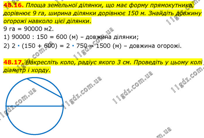 48.16. Площа земельної ділянки, що має форму прямокутника, дорівнює 9 га, ширина ділянки дорівнює 150 м. Знайдіть довжину огорожі навколо цієї ділянки. 9 га = 90000 м2. 1) 90000 : 150 = 600 (м) – довжина ділянки; 2) 2 ∙ (150 + 600) = 2 ∙ 750 = 1500 (м) – довжина огорожі. 48.17. Накресліть коло, радіус якого 3 см. Проведіть у цьому колі діаметр і хорду.