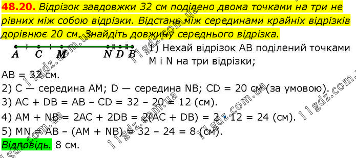 Відрізок завдовжки 32 см поділено двома точками на три не рівних між собою відрізки. Відстань між серединами крайніх відрізків дорівнює 20 см. Знайдіть довжину середнього відрізка. 1) Нехай відрізок AB поділений точками M і N на три відрізки; AB = 32 см. 2) C — середина AM; D — середина NB; CD = 20 см (за умовою). 3) AC + DB = AB – CD = 32 – 20 = 12 (см). 4) AM + NB = 2AC + 2DB = 2(AC + DB) = 2 ∙ 12 = 24 (см). 5) MN = AB – (AM + NB) = 32 – 24 = 8 (см). Відповідь. 8 см.