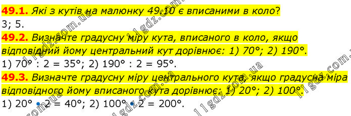 49.1. Які з кутів на малюнку 49.10 є вписаними в коло? 3; 5. 49.2. Визначте градусну міру кута, вписаного в коло, якщо відповідний йому центральний кут дорівнює: 1) 70°; 2) 190°. 1) 70° : 2 = 35°; 2) 190° : 2 = 95°. 49.3. Визначте градусну міру центрального кута, якщо градусна міра відповідного йому вписаного кута дорівнює: 1) 20°; 2) 100°. 1) 20° • 2 = 40°; 2) 100° • 2 = 200°.