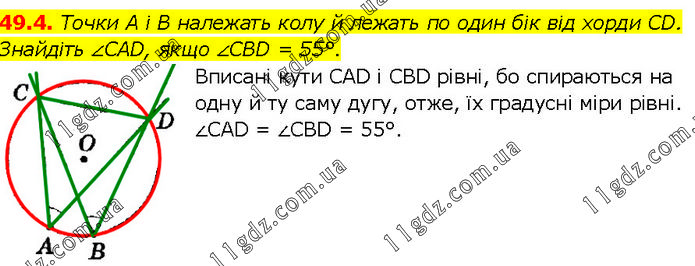 Точки A i B належать колу й лежать по один бік від хорди CD. Знайдіть ∠CAD, якщо ∠CBD = 55°. Вписані кути CAD і CBD рівні, бо спираються на одну й ту саму дугу, отже, їх градусні міри рівні. ∠CAD = ∠CBD = 55°.
