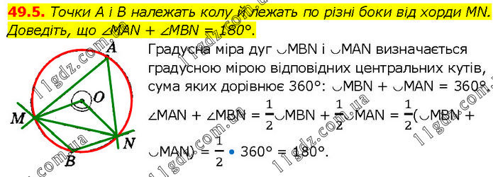 Точки A i B належать колу й лежать по різні боки від хорди MN. Доведіть, що ∠MAN + ∠MBN = 180°. Градусна міра дуг ◡MBN і ◡MAN визначається градусною мірою відповідних центральних кутів, сума яких дорівнює 360°: ◡MBN + ◡MAN = 360°. ∠MAN + ∠MBN = 1/2◡MBN + 1/2◡MAN = 1/2(◡MBN + ◡MAN) = 1/2 • 360° = 180°.