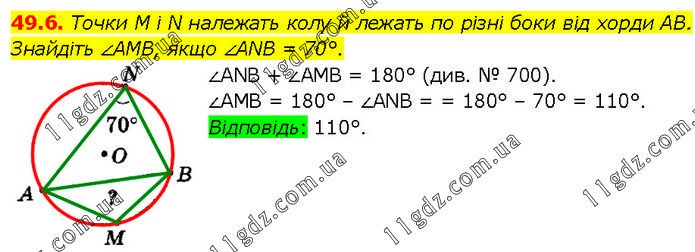 Точки M i N належать колу й лежать по різні боки від хорди AB. Знайдіть ∠AMB, якщо ∠ANB = 70°. ∠ANB + ∠AMB = 180° (див. № 700). ∠AMВ = 180° – ∠ANB = 180° – 70° = 110°. Відповідь: 110°.