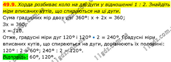 Хорда розбиває коло на дві дуги у відношенні 1 : 2. Знайдіть міри вписаних кутів, що спираються на ці дуги. Сума градусних мір двох дуг 360°: х + 2х = 360; Зх = 360; х = 120. Отже, градусні міри дуг 120° і 120° • 2 = 240°. Градусні міри вписаних кутів, що спираються на дуги, дорівнюють їх половині: 120° : 2 = 60°; 240° : 2 = 120°. Відповідь: 60°, 120°.