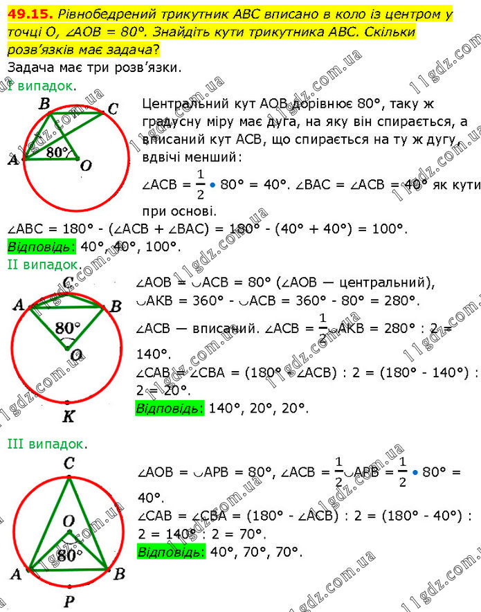 Рівнобедрений трикутник ABC вписано в коло із центром у точці О, ∠AOB = 80°. Знайдіть кути трикутника ABC. Скільки розв’язків має задача? Задача має три розв’язки. I випадок. Центральний кут АОВ дорівнює 80°, таку ж градусну міру має дуга, на яку він спирається, а вписаний кут АСВ, що спирається на ту ж дугу, вдвічі менший: ∠АСВ = 1/2 • 80° = 40°. ∠ВАС = ∠АСВ = 40° як кути при основі. ∠АВС = 180° – (∠АСВ + ∠ВАС) = 180° – (40° + 40°) = 100°. Відповідь: 40°, 40°, 100°. II випадок. ∠АОВ = ◡АСВ = 80° (∠АОВ — центральний), ◡АКВ = 360° – ◡АСВ = 360° – 80° = 280°. ∠АСВ — вписаний. ∠АСВ = 1/2◡АKВ = 280° : 2 = 140°. ∠CAB = ∠CBA = (180° – ∠АСВ) : 2 = (180° – 140°) : 2 = 20°. Відповідь: 140°, 20°, 20°. III випадок. ∠АОВ = ◡AРВ = 80°, ∠АСВ = 1/2◡АРВ = 1/2 • 80° = 40°. ∠САВ = ∠СВА = (180° – ∠АСВ) : 2 = (180° – 40°) : 2 = 140° : 2 = 70°. Відповідь: 40°, 70°, 70°.