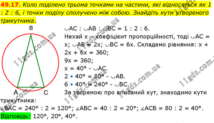 Коло поділено трьома точками на частини, які відносяться як 1 : 2 : 6, і точки поділу сполучено між собою. Знайдіть кути утвореного трикутника. ◡AC : ◡AB : ◡BC = 1 : 2 : 6. Нехай х – коефіцієнт пропорційності, тоді ◡АС = x; ◡AB = 2x; ◡BC = 6x. Складемо рівняння: х + 2х + 6х = 360; 9х = 360; х = 40° – ◡АС. 2 • 40° = 80° – ◡AB. 6 • 40° = 240° – ◡ВС. За теоремою про вписаний кут, знаходимо кути трикутника: ∠ВАС = 240° : 2 = 120°; ∠АВС = 40 : 2 = 20°; ∠АСВ = 80 : 2 = 40°. Відповідь: 120°, 20°, 40°.