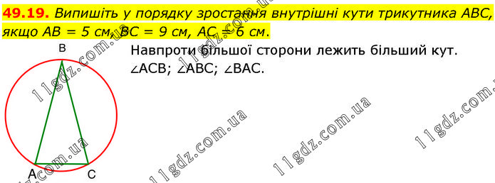 Випишіть у порядку зростання внутрішні кути трикутника ABC, якщо AB = 5 см, BC = 9 см, AC = 6 см. Навпроти більшої сторони лежить більший кут. ∠АСВ; ∠АВС; ∠ВАС.