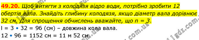 Щоб витягти з колодязя відро води, потрібно зробити 12 обертів вала. Знайдіть глибину колодязя, якщо діаметр вала дорівнює 32 см. Для спрощення обчислень вважайте, що n = 3. l = 3 • 32 = 96 (см) – довжина кола вала. 12 • 96 = 1152 см = 11 м 52 см.