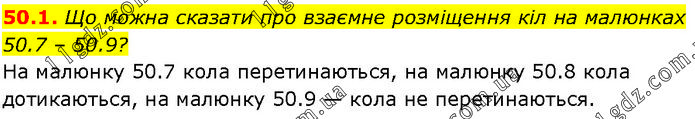 Що можна сказати про взаємне розміщення кіл на малюнках 50.7 – 50.9? На малюнку 50.7 кола перетинаються, на малюнку 50.8 кола дотикаються, на малюнку 50.9 — кола не перетинаються.