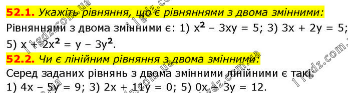 52.1. Укажіть рівняння, що є рівняннями з двома змінними: Рівняннями з двома змінними є: 1) х2 – 3ху = 5; 3) 3х + 2y = 5; 5) х + 2х2 = у – 3y2. 52.2. Чи є лінійним рівняння з двома змінними: Серед заданих рівнянь з двома змінними лінійними є такі: 1) 4х – 5у = 9; 3) 2х + 11y = 0; 5) 0x + 3y = 12.