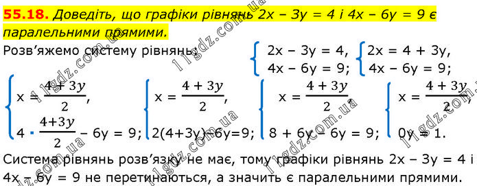 Доведіть, що графіки рівнянь 2х – Зу = 4 і 4х – 6у = 9 є паралельними прямими.