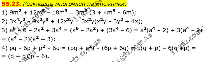 Розкладіть многочлен на множники: 1) 9m2 + 12m5 – 18m3 = Зm2 (3 + 4m3 – 6m); 2) 3x4y2 – 9х2y3 + 12x3y = Зх2у(x2у – Зу2 + 4х); 3) а6 – 6 – 2а2 + 3а4 = (а6 – 2a2) + (За4 – 6) = а2(а4 – 2) + 3(а4 – 2) = (a4 – 2)(a2 + 3); 4) рq – 6р + р2 – 6q = (pq + р2) – (6р + 6q) = p(q + р) – 6(q + р) = (q + р)(р – 6).
