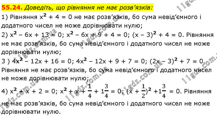 Доведіть, що рівняння не має розв’язків: 1) Рівняння x2 + 4 = 0 не має розв’язків, бо сума невід’ємного і додатного чисел не може дорівнювати нулю; 2) x2 – 6х + 13 = 0; x2 – 6х + 9 + 4 = 0; (х – 3)2 + 4 = 0. Рівняння не має розв’язків, бо сума невід’ємного і додатного чисел не може дорівнювати нулю; 3 ) 4x2 – 12х + 16 = 0; 4х2 – 12х + 9 + 7 = 0; (2х – 3)2 + 7 = 0. Рівняння не має розв’язків, бо сума невід’ємного і додатного чисел не може дорівнювати нулю; 4) x2 + x + 2 = 0; x2 + x + 1/4 + 13/4 = 0; (х + 1/2)2 +13/4 = 0. Рівняння не має розв’язків, бо сума невід’ємного і додатного чисел не може дорівнювати нулю.