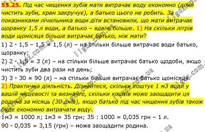 Під час чищення зубів мати витрачає воду економно (доки чистить зуби, кран закручує), а батько цього не робить. За показниками лічильника води діти встановили, що мати витрачає щоранку 1,5 л води, а батько – вдвічі більше. 1) На скільки літрів води щомісяця більше витрачає батько, ніж мати? 1) 2 ∙ 1,5 – 1,5 = 1,5 (л) – на стільки більше витрачає води батько, щоранку; 2) 2 ∙ 1,5 = 3 (л) – на стільки більше витрачає батько щодоби, якщо чистить зуби два рази на день; 3) 3 ∙ 30 = 90 (л) – на стільки більше витрачає батько щомісяця. 2) Практична діяльність. Дізнайтеся, скільки коштує 1 м3 води у вашій місцевості та визначте, скільки коштів може заощадити ця родина за місяць (30 днів), якщо батько під час чищення зубів також буде економно витрачати воду. 1м3 = 1000 л; 1м3 = 35 грн; 35 : 1000 = 0,035 грн – 1 л. 90 ∙ 0,035 = 3,15 (грн) – може заощадити родина.