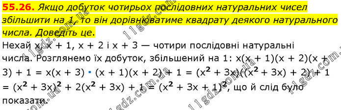 Якщо добуток чотирьох послідовних натуральних чисел збільшити на 1, то він дорівнюватиме квадрату деякого натурального числа. Доведіть це. Нехай х, х + 1, х + 2 і х + 3 — чотири послідовні натуральні числа. Розглянемо їх добуток, збільшений на 1: х(х + 1)(х + 2)(х + 3) + 1 = х(х + 3) ∙ (х + 1)(х + 2) + 1 = (х2 + Зх)((х2 + Зх) + 2) + 1 = (х2 + Зх)2 + 2(х2 + Зх) + 1 = (х2 + Зх + 1)2, що й слід було показати.