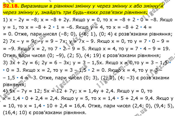 Виразивши в рівнянні змінну у через змінну х або змінну х через змінну у, знайдіть три будь–яких розв’язки рівняння: 1) х – 2y = –8; х = –8 + 2у. Якщо у = 0, то х = –8 + 2 ∙ 0 = –8. Якщо у = 1, то х = –8 + 2 ∙ 1 = –6. Якщо у = 4, то х = –8 + 2 ∙ 4 = 0. Отже, пари чисел (–8; 0), (–6; 1), (0; 4) є розв’язками рівняння; 2) 7x – у = 9; –у = 9 – 7х; у = 7x – 9. Якщо х = 0, то у = 7 ∙ 0 – 9 = –9. Якщо х = 2, то 7 ∙ 2 – 9 = 5. Якщо х = 4, то у = 7 ∙ 4 – 9 = 19. Отже, пари чисел (0; –9), (2; 5), (4; 19) є розв’язками рівняння; 3) 3х + 2у = 6; 2y = 6 – 3х; у = 3 – 1,5х. Якщо х = 0,то y = 3 – 1,5 ∙ 0 = 3. Якщо х = 2, то у = 3 – 1,5 ∙ 2 = 0. Якщо х = 4, то у = 3 – 1,5 ∙ 4 = –3. Отже, пари чисел (0; 3), (2; 0), (4; –3) є розв’язками рівняння; 4) 5x – 7y = 12; 5х = 12 + 7y; х = 1,4у + 2,4. Якщо у = 0, то х = 1,4 ∙ 0 + 2,4 = 2,4. Якщо у = 5, то х = 1,4 ∙ 5 + 2,4 = 9,4. Якщо у = 10, то х = 1,4 ∙ 10 + 2,4 = 16,4. Отже, пари чисел (2,4; 0), (9,4; 5), (16,4; 10) є розв’язками рівняння.