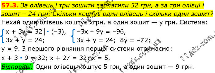 За олівець і три зошити заплатили 32 грн, а за три олівці і зошит – 24 грн. Скільки коштує один олівець і скільки один зошит? Нехай один олівець коштує хгрн, а один зошит — у грн. Система: