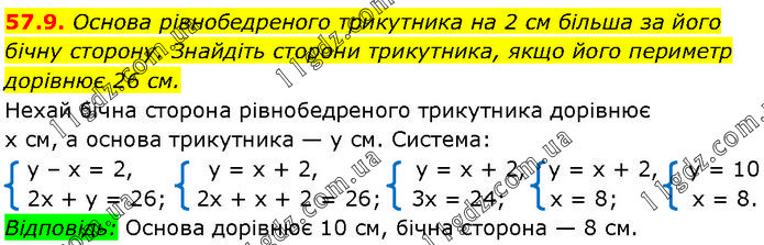 Основа рівнобедреного трикутника на 2 см більша за його бічну сторону. Знайдіть сторони трикутника, якщо його периметр дорівнює 26 см. Нехай бічна сторона рівнобедреного трикутника дорівнює x см, а основа трикутника — у см. Система: