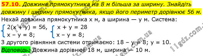 Довжина прямокутника на 8 м більша за ширину. Знайдіть довжину і ширину прямокутника, якщо його периметр дорівнює 56 м. Нехай довжина прямокутника x м, а ширина — у м. Система: