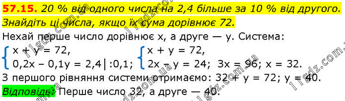 20 % від одного числа на 2,4 більше за 10 % від другого. Знайдіть ці числа, якщо їх сума дорівнює 72. Нехай перше число дорівнює х, а друге — у. Система: