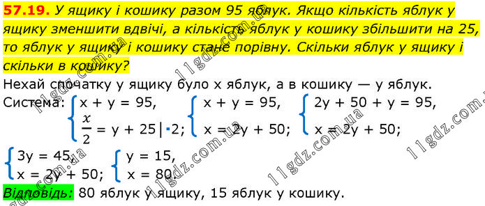У ящику і кошику разом 95 яблук. Якщо кількість яблук у ящику зменшити вдвічі, а кількість яблук у кошику збільшити на 25, то яблук у ящику і кошику стане порівну. Скільки яблук у ящику і скільки в кошику? Нехай спочатку у ящику було х яблук, а в кошику — у яблук.