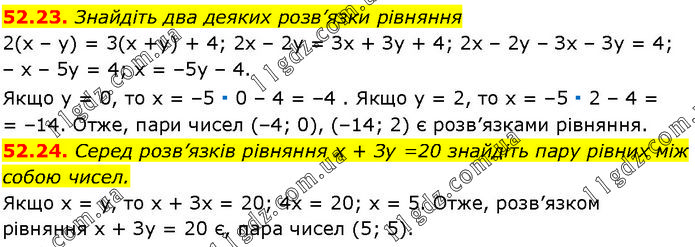 52.23. Знайдіть два деяких розв’язки рівняння 2(х – у) = 3(х +у) + 4; 2х – 2у = Зх + Зу + 4; 2х – 2у – Зх – Зу = 4; – х – 5у = 4; х = –5y – 4. Якщо у = 0, то х = –5 ∙ 0 – 4 = –4 . Якщо y = 2, то х = –5 ∙ 2 – 4 = –14. Отже, пари чисел (–4; 0), (–14; 2) є розв’язками рівняння. 52.24. Серед розв’язків рівняння х + Зу =20 знайдіть пару рівних між собою чисел. Якщо х = у, то х + Зх = 20; 4х = 20; х = 5. Отже, розв’язком рівняння х + Зу = 20 є, пара чисел (5; 5).