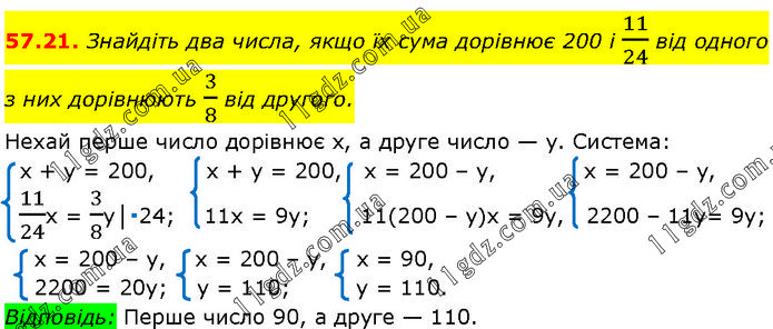 Знайдіть два числа, якщо їх сума дорівнює 200 і 11/24 від одного з них дорівнюють 3/8 від другого. Нехай перше число дорівнює х, а друге число — у. Система: